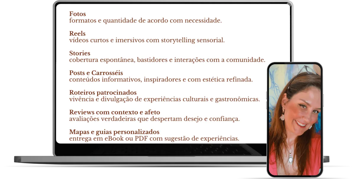 Meu trabalho é criar conteúdos que inspiram o público a olhar o mundo com mais curiosidade e sensibilidade: se perder em uma exposição, se emocionar com um show ao ar livre, provar um prato que conta uma história, ou se hospedar em um lugar que faz parte da memória afetiva da viagem.
